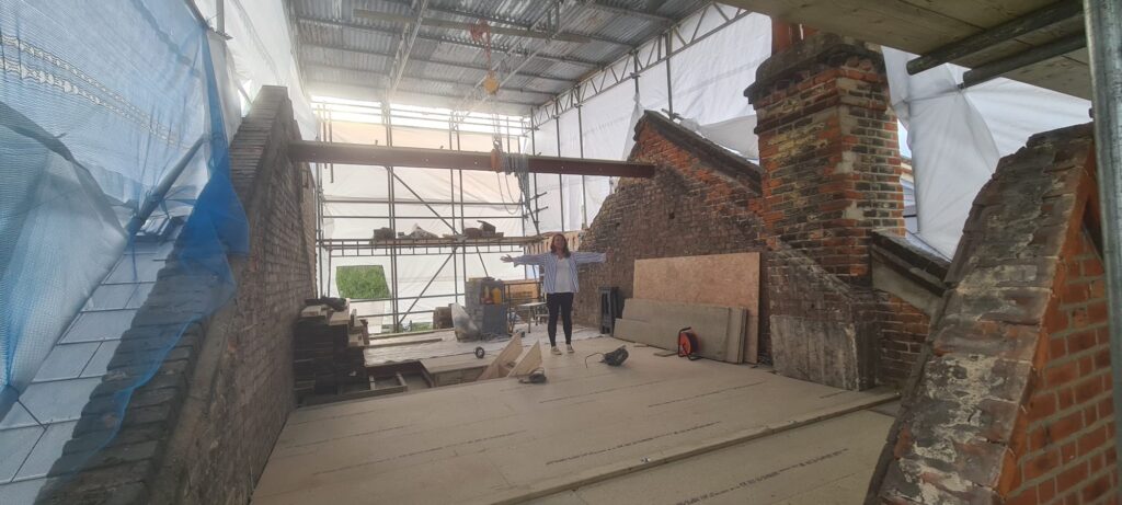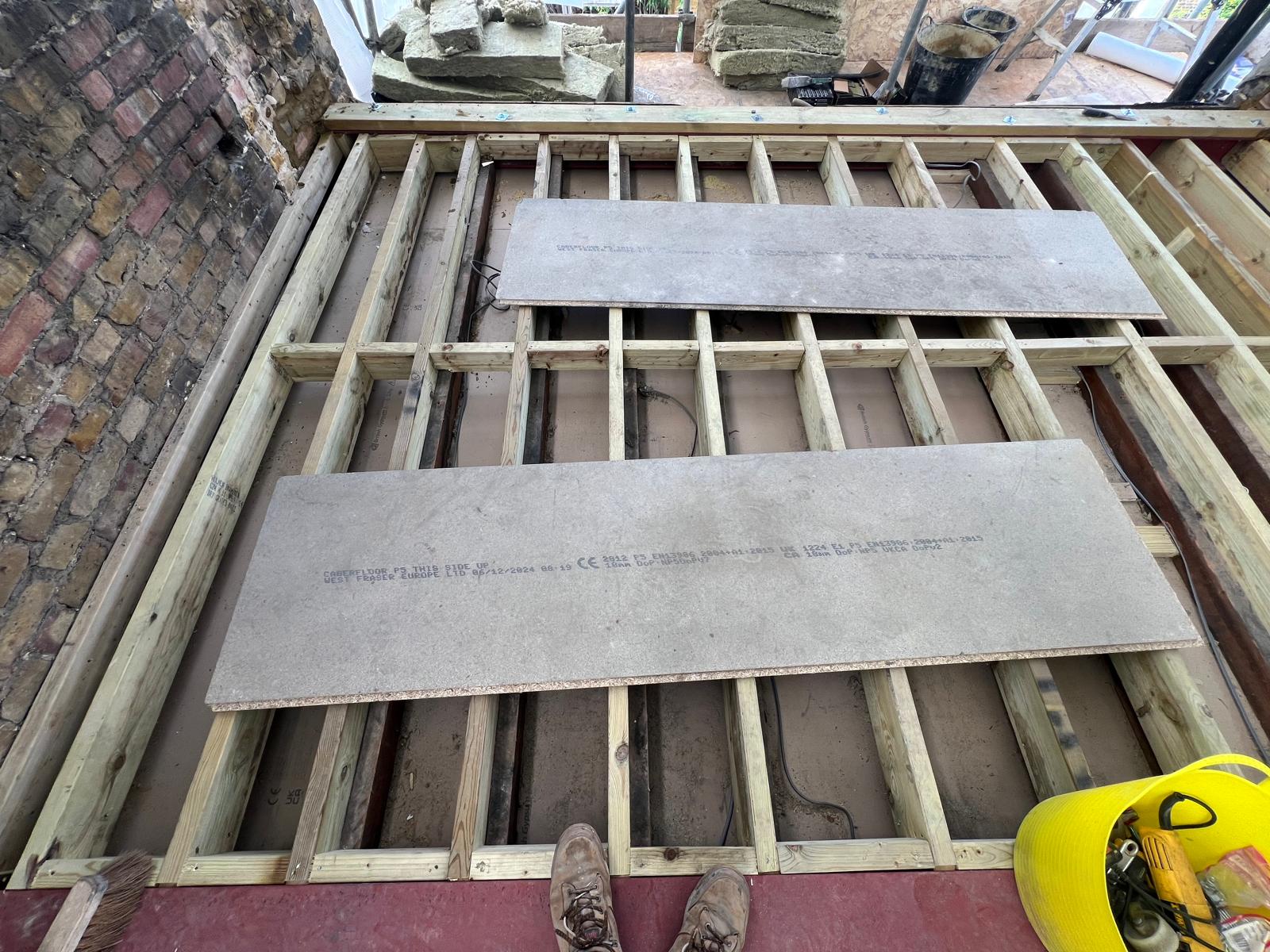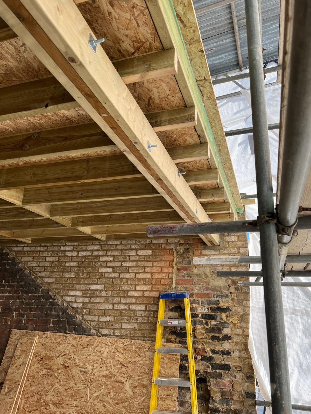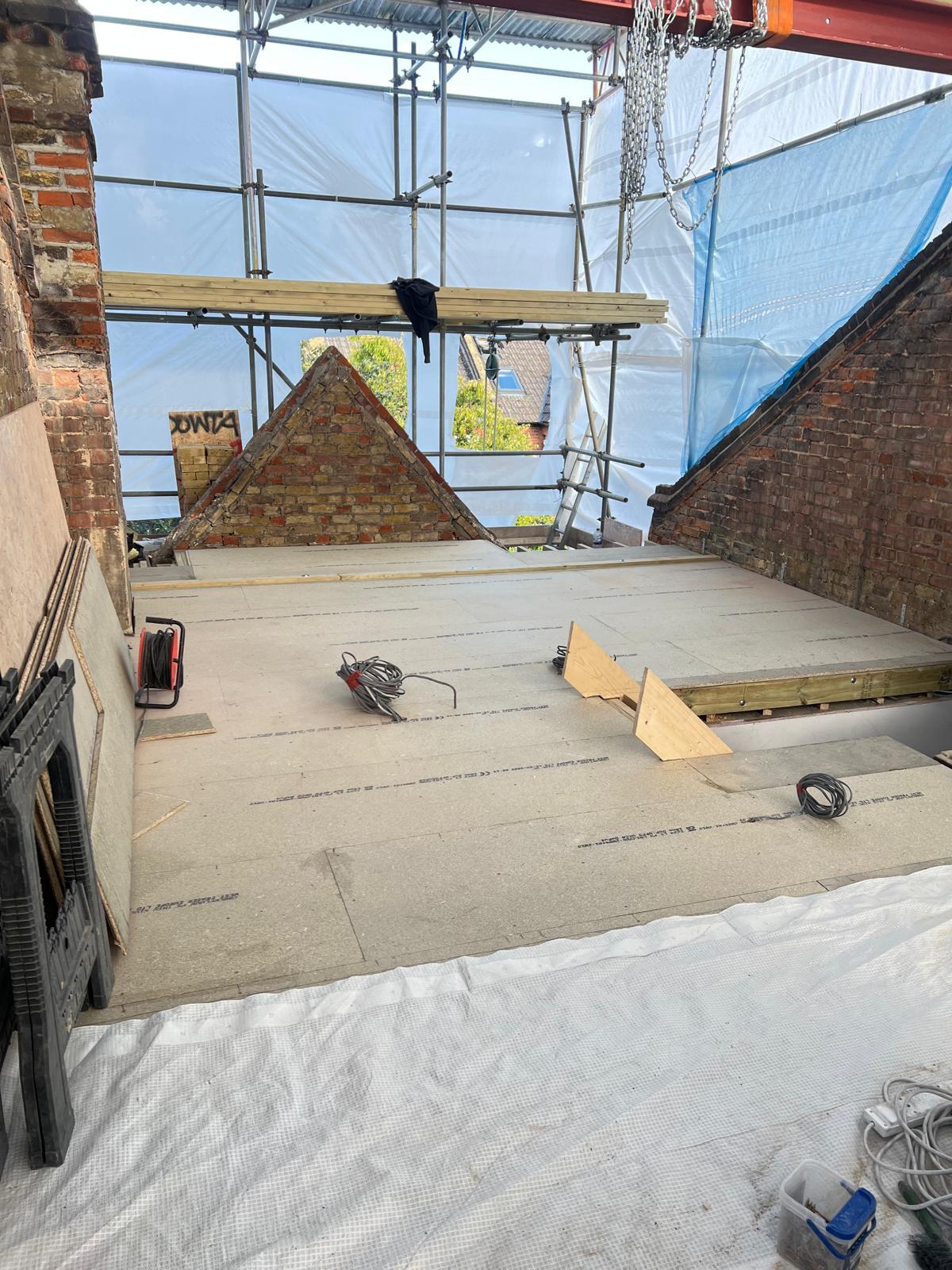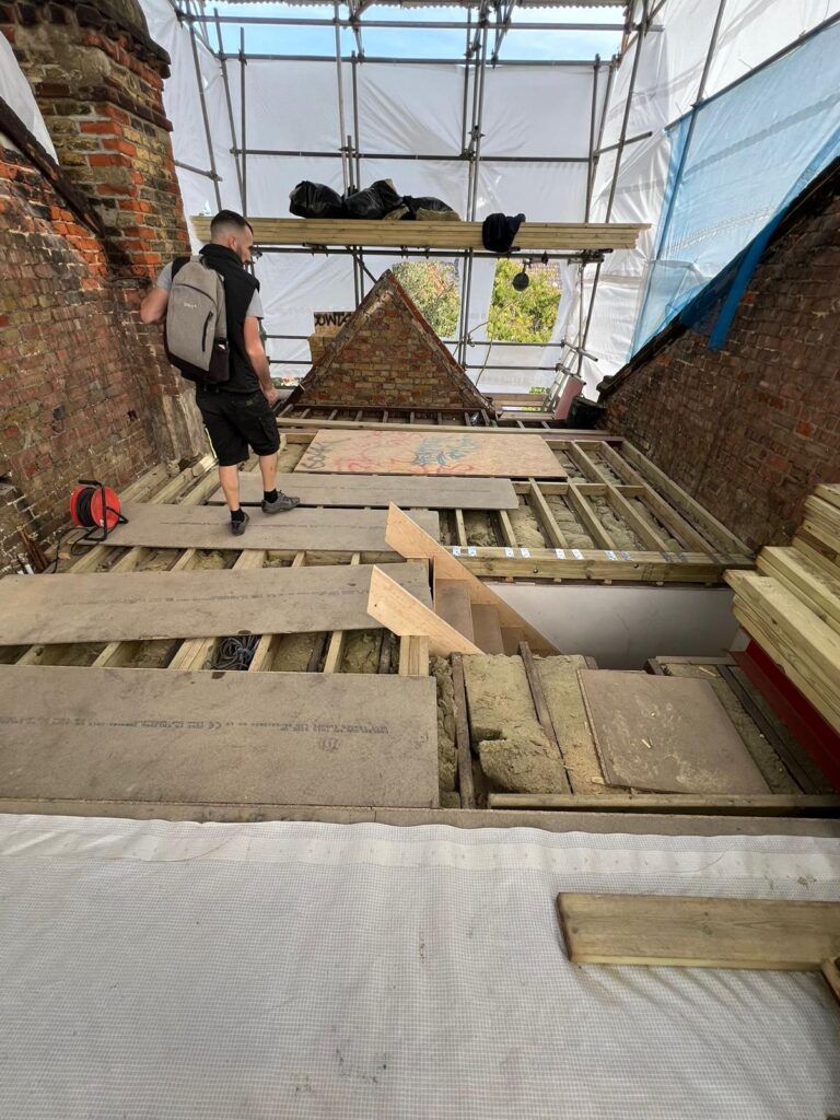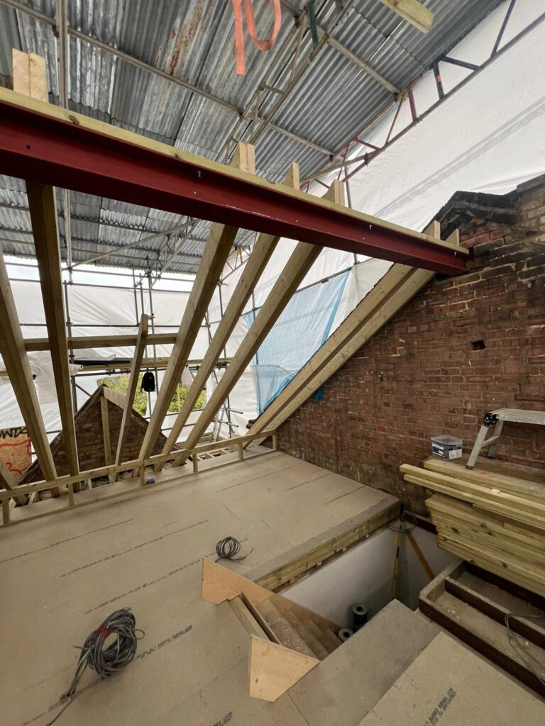 Once the demolition of the roof structure and removal of chimneys is complete it is time to work on the floor. A common misconception is that you can just put the new floor on top of the existing ceiling of the floor below. This is not the case the ceilings tend to be built of 2/4-inch timber, strong enough to support a lath and plaster or plasterboard ceiling but not a floor with people, walls and furniture etc on. So the new floor is reinforced with a steel I-beam, with pockets cut into the brick walls to house it and bearing plates set into each gable end. These steels in turn can then have structural timber fitted into the recesses and the floor built on top them.