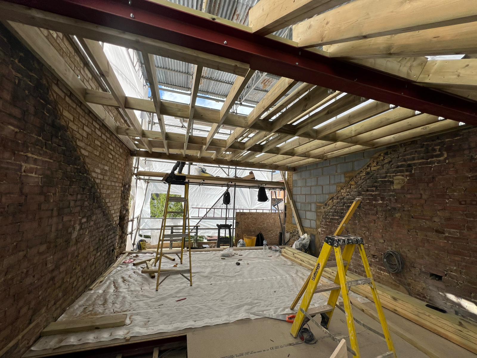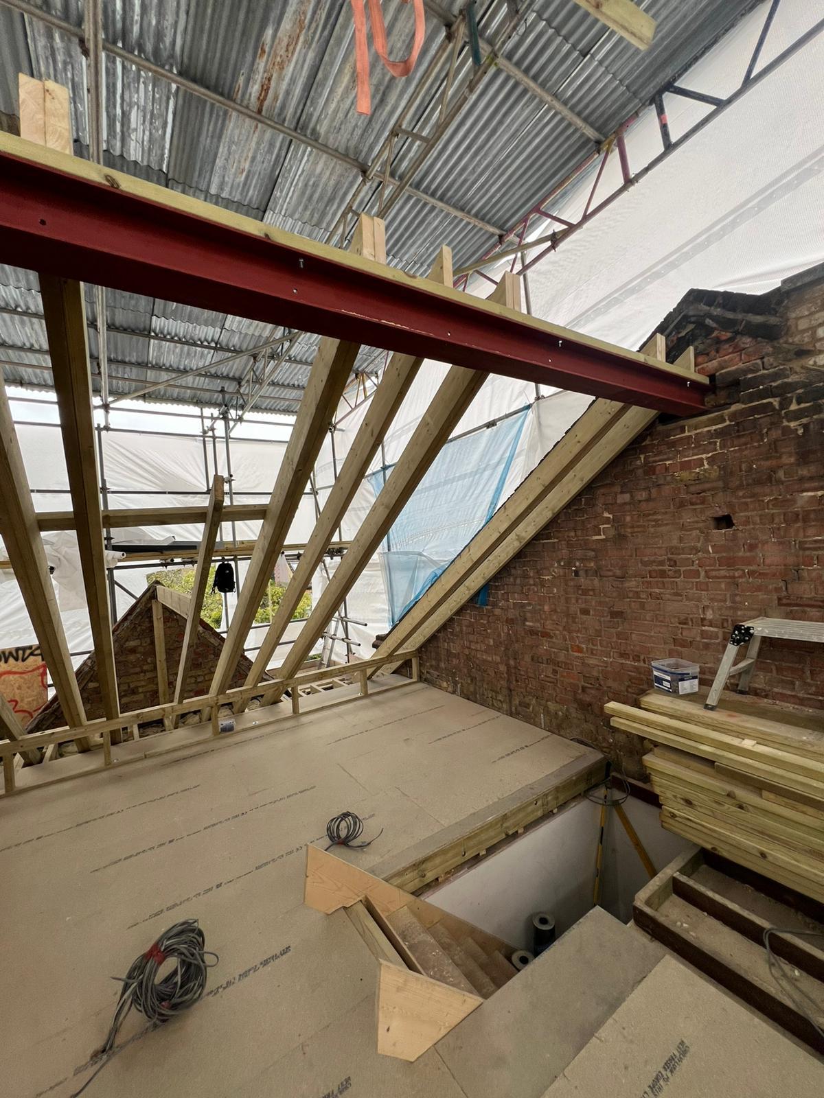 Once planning or permitted development has been submitted and granted, structural engineering drawings need to be calculated and created. At the beginning of the build the first step is to get well designed scaffolding in place front and back, taking the load of a full temporary metal roof (or Tin Hat), this helps to keep the house dry during the build and the builders dry too, which we appreciate.