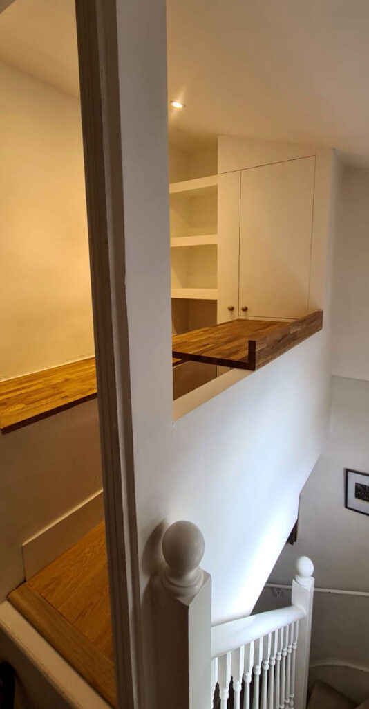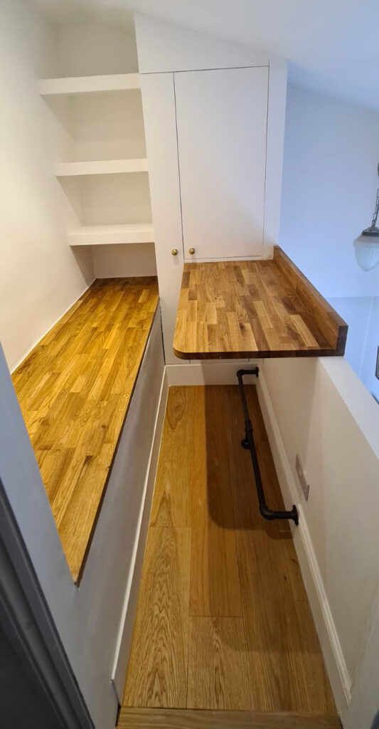 Finding that quiet spot to think clearly and work at home can be hard. In this central London property a cupboard can be the solution, by cutting a hole in the wall and building a desk and bench this small space can be made to feel part of the hallway and provide views of the garden and natural light from the opposite window. Utilizing warm, natural materials, we’ve created a workspace that is both fun and efficient to work in. The cleverly integrated storage space ensures a clean and organized environment, allowing for a spacious feel and an expansive view that inspires productivity and creativity.